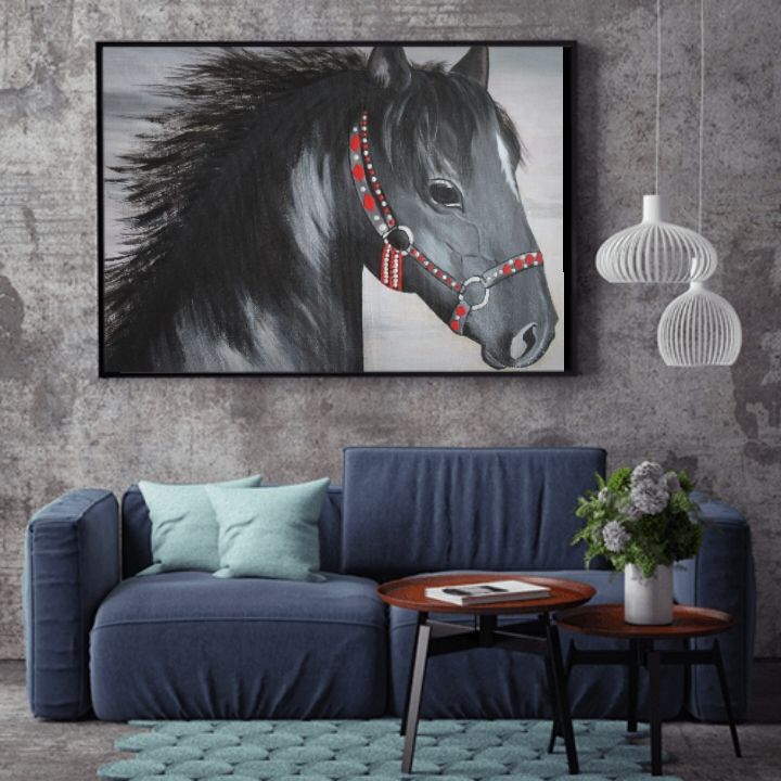 Black Red Beauty a fost o provocare de a surprinde, in primul meu tablou realist, frumusetea acestor animale marete. Tabloul a fost pictat pe panza de bumbac intinsa pe sasiu din lemn, folosind vopsele acrilice mate si sidefate. Pentru protejarea picturii s-a folosit varnish final lucios in multiple straturi. Tabloul se livreaza cu marginile pictate si agatatoare pe spate, gata pentru a fi montat pe perete.