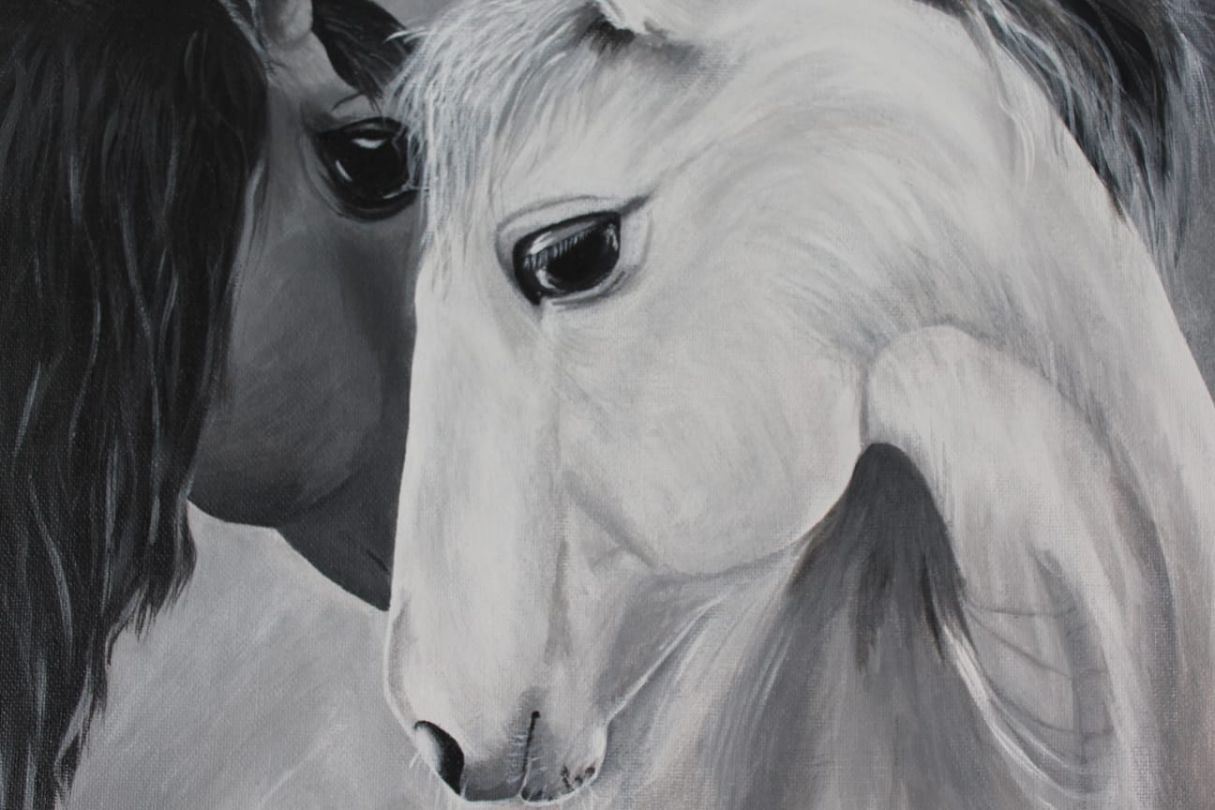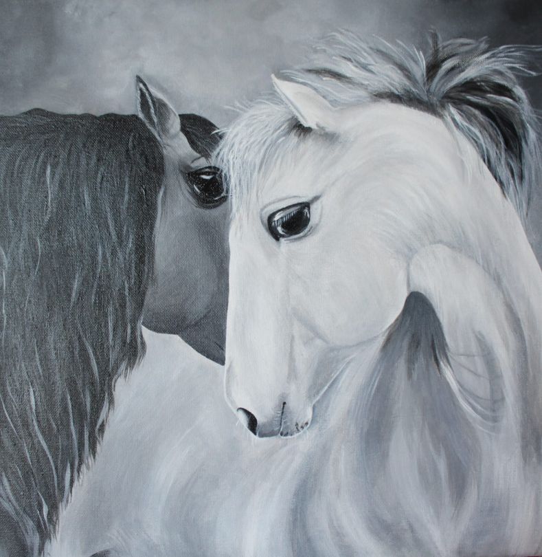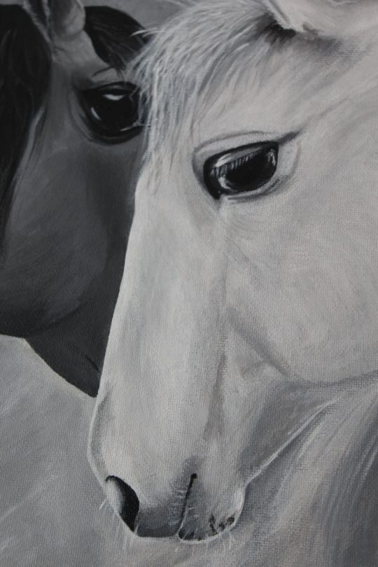 Prin aceasta pictura am vrut sa infatisez frumusetea cailor in culori simple si contraste, fara a pierde insa blandetea din ochii lor. Tabloul a fost pictat pe panza de bumbac intinsa pe sasiu din lemn, folosind vopsele acrilice mate si sidefate. Pentru protejarea picturii s-a folosit varnish final lucios in multiple straturi. Tabloul se livreaza cu marginile pictate si agatatoare pe spate, gata pentru a fi montat pe perete.