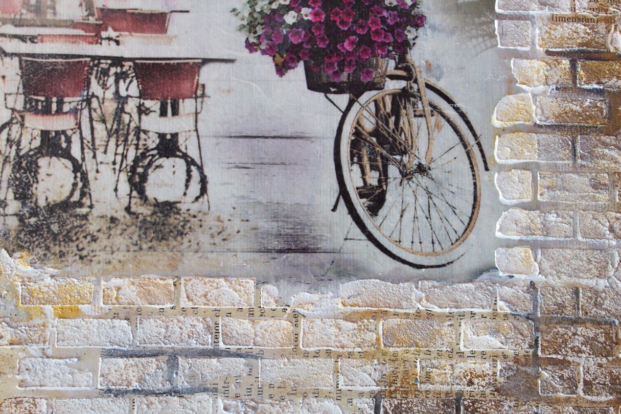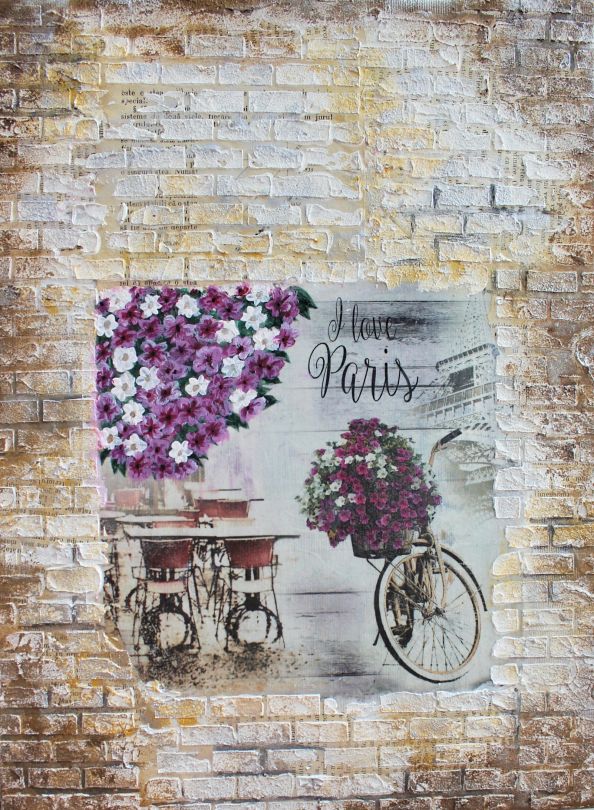 Un inceput de zi linistit pe strazile inguste si pline de farmec din Orasul Luminilor - Tablou Mixed Media, pictat manual pe panza de bumbac triplu grunduita, folosind vopsele acrilice mate si sidefate.