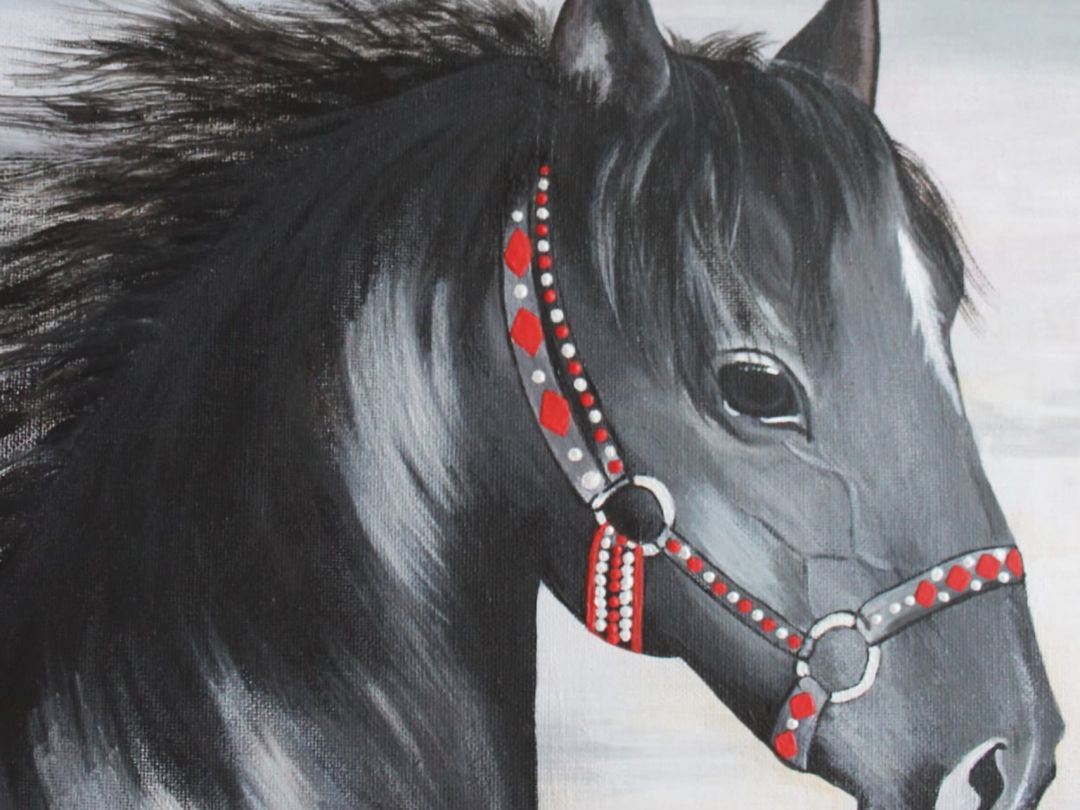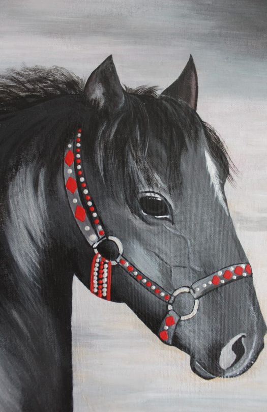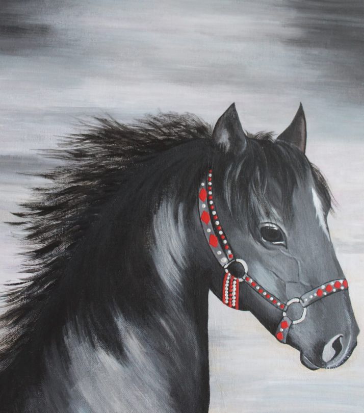 Black Red Beauty a fost o provocare de a surprinde, in primul meu tablou realist, frumusetea acestor animale marete. Tabloul a fost pictat pe panza de bumbac intinsa pe sasiu din lemn, folosind vopsele acrilice mate si sidefate. Pentru protejarea picturii s-a folosit varnish final lucios in multiple straturi. Tabloul se livreaza cu marginile pictate si agatatoare pe spate, gata pentru a fi montat pe perete.